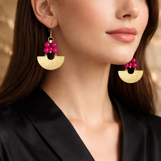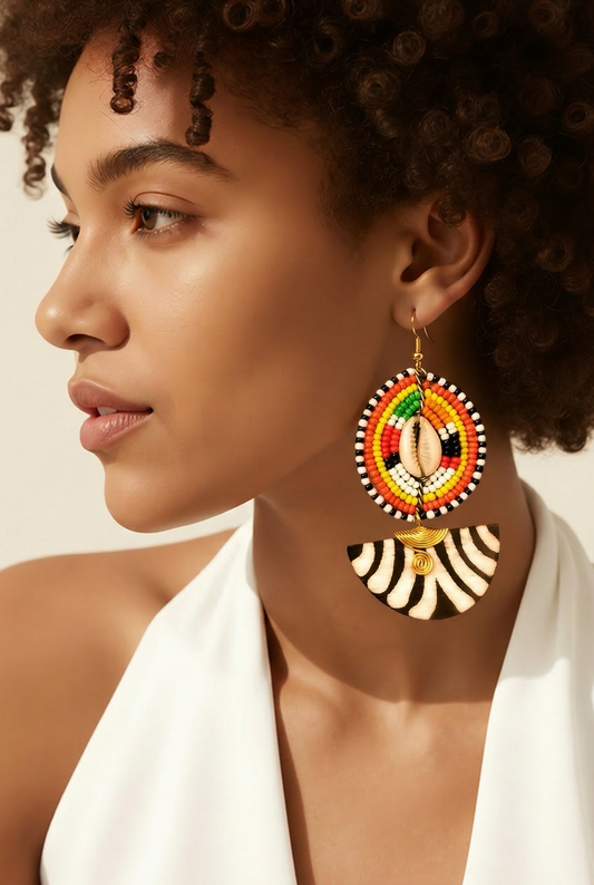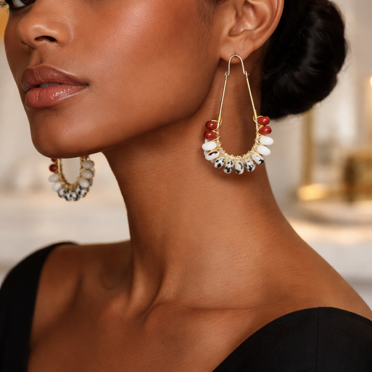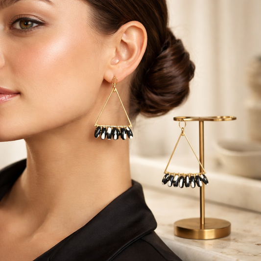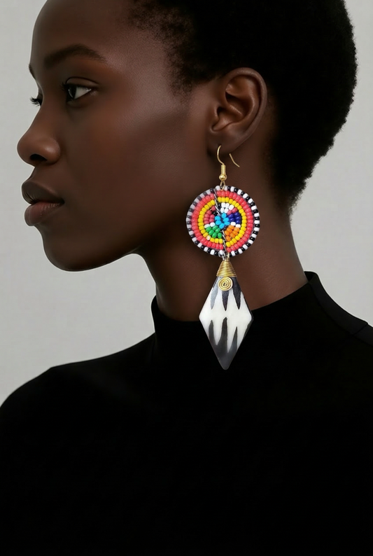 A unique blend of wrapped hoop earrings, beaded designs, brass triangle accents, and beautiful statement...