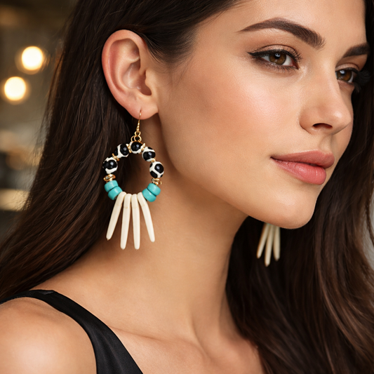 Elegant Glass Bead Earrings, Turquoise Glass Beads, White Coconut Wood Spike Bead, Tibetan Agate with...