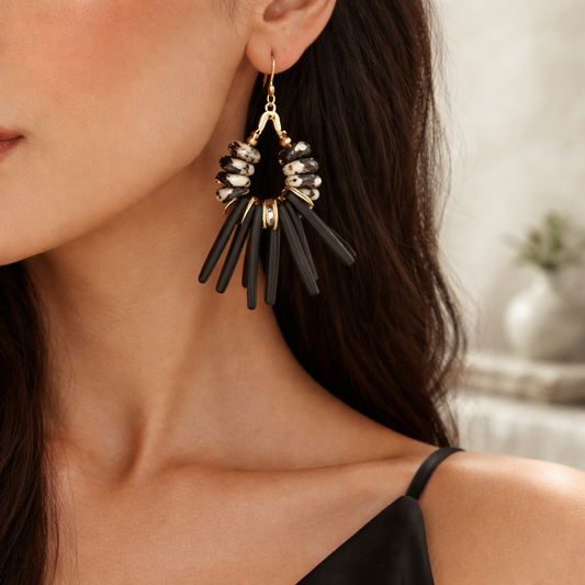 Elegant Striped Mala Bone Bead Earrings featuring Black Coconut Wood Spike Beads and a sophisticated...