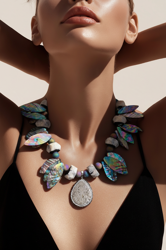 Elevate your style with our natural rainbow shell necklace featuring a crystal encrusted pendant. The...