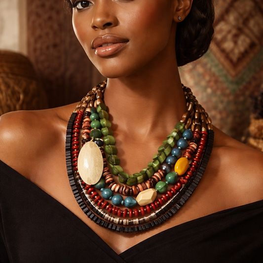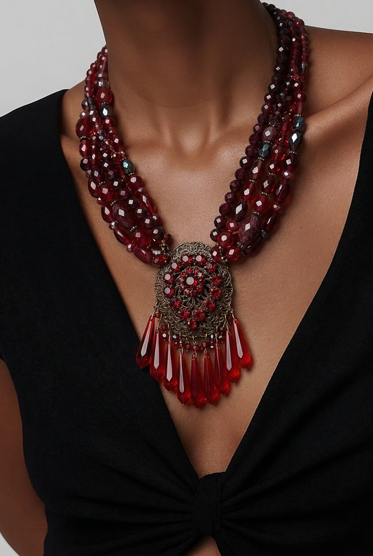 Elegant and sophisticated, this statement piece features a layered design with mixed beads and metallic...