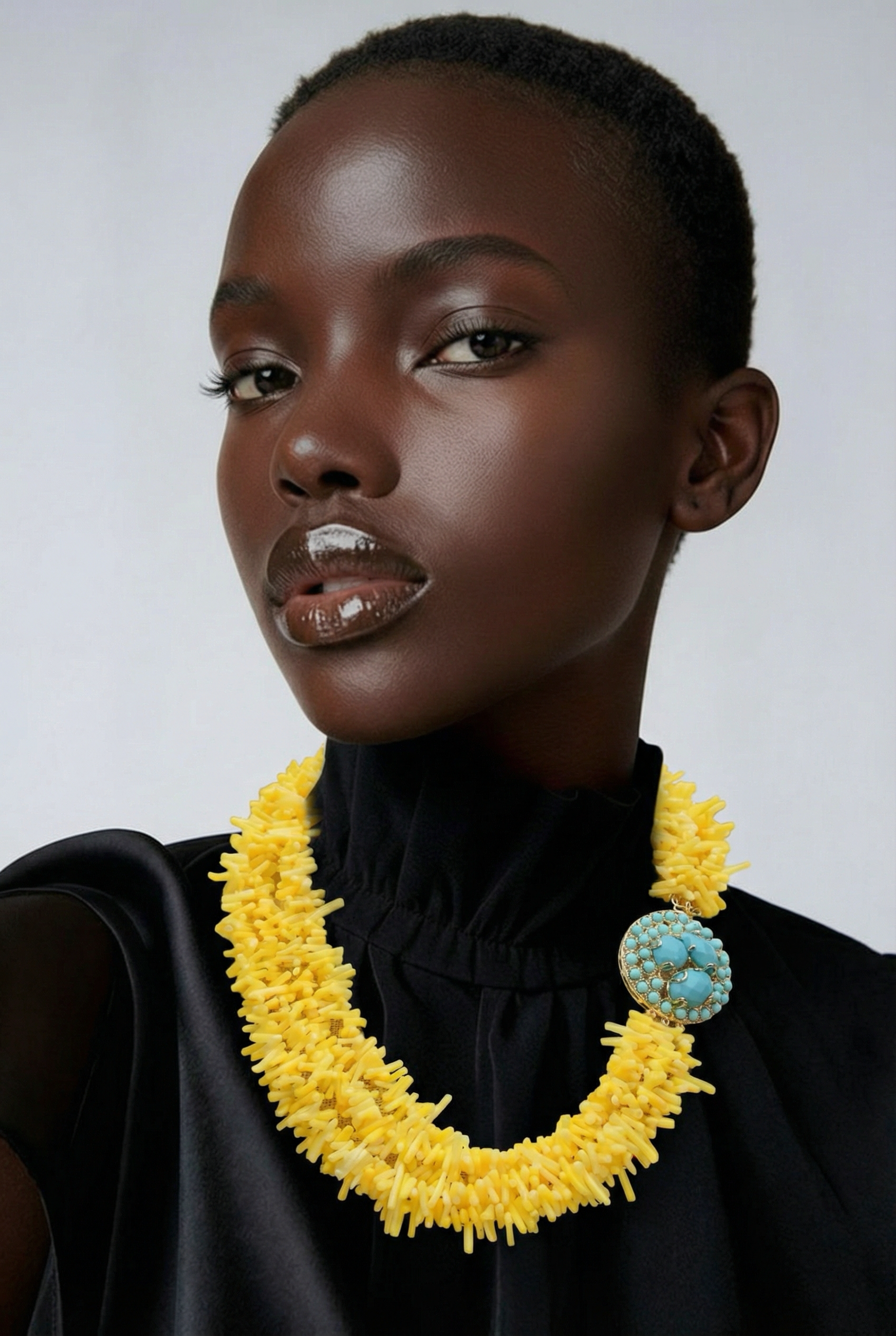 Elevate your style with this stunning 18'' 5 Rows Yellow Coral Chips Branch Necklace featuring a unique design and vibrant colors. The elegant Gold Plated Blue Turquoise Flower Clasp adds a touch of sophistication. A must-have accessory for any lady!