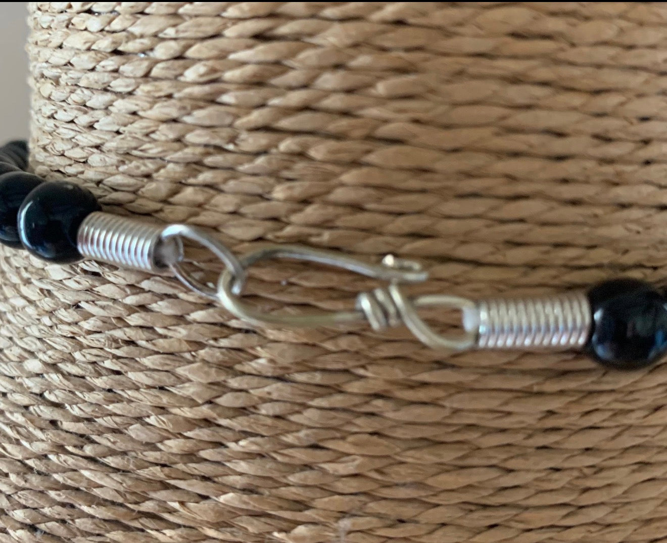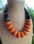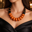 This exquisite handbeaded necklace features round resin beads paired with two elongated, naturally striped buffalo horn beads. It fastens securely with a hook and measures 53 cm in length. The beads are 2 cm in size, while the horn beads span 9 cm.