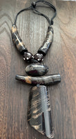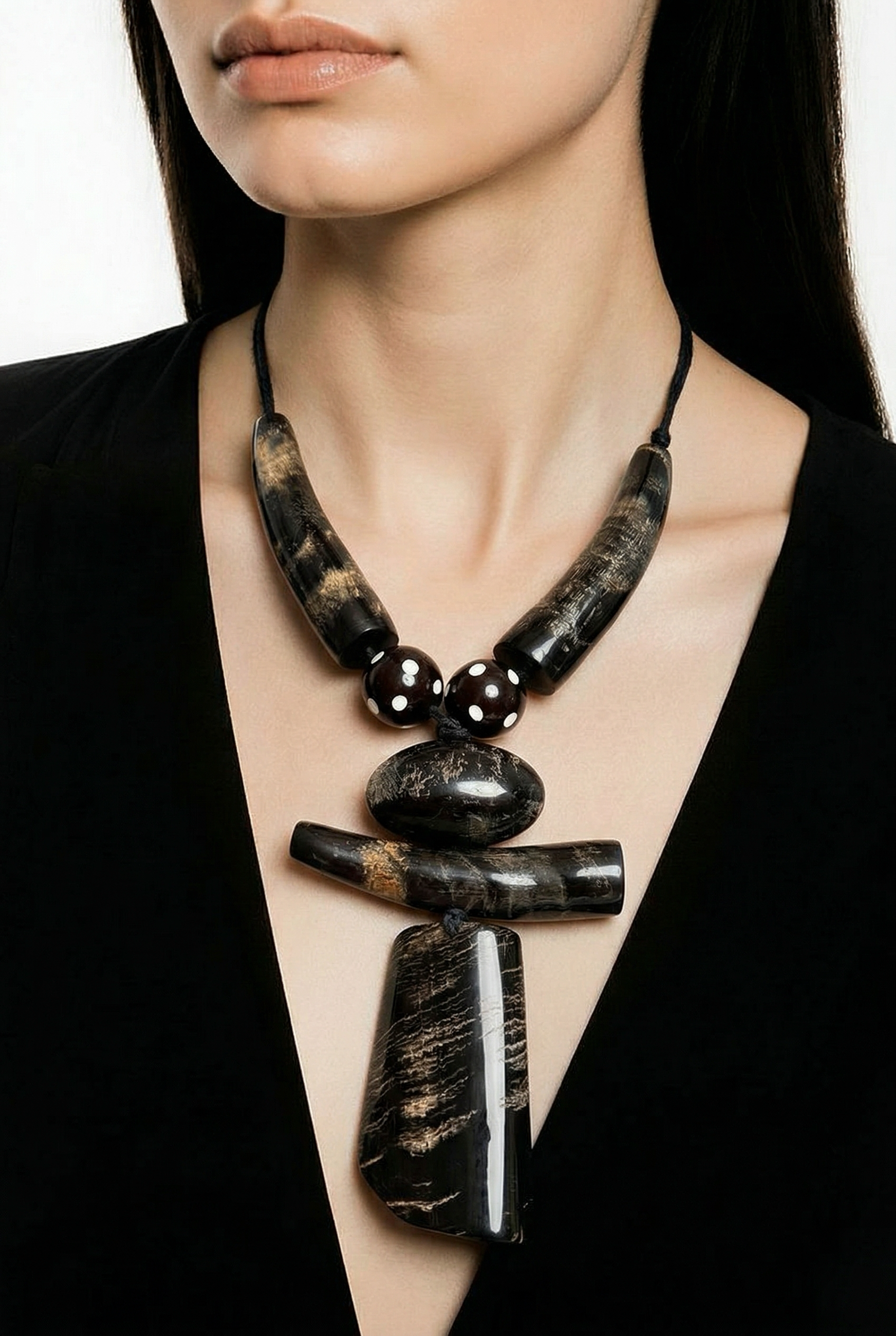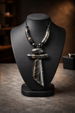 Elevate your style with this bold, sculptural necklace featuring layered geometric elements. Crafted from polished horn with natural variations in color and pattern, it showcases modern artistry and natural elegance. Perfect for those who appreciate distinctive, handcrafted accessories.