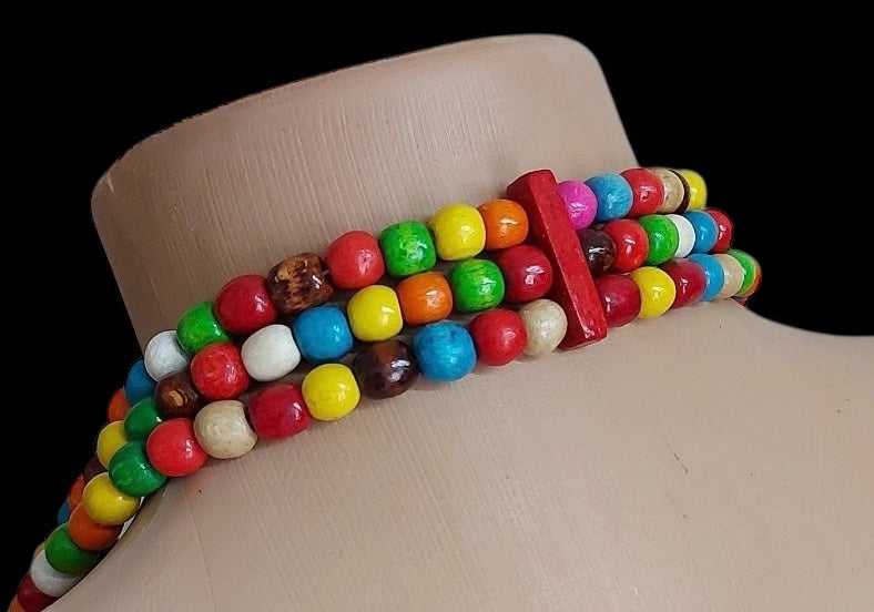 This exquisite multicolor necklace features wooden beads that are crafted from environmentally friendly materials sourced from the Carpathian Mountains in western Ukraine, showcasing vibrant colors. Necklace is elastic.
